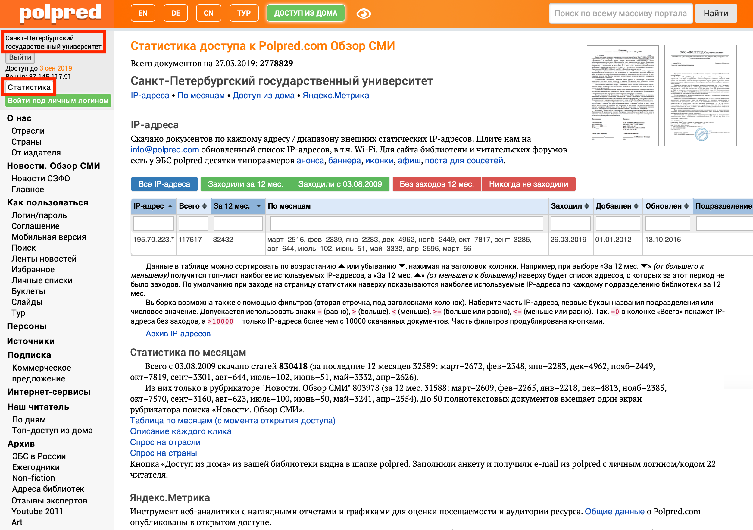 Wish to check if the access is functioning? When you enter the polpred.com website you can see the name of the library, period of availability and Statistics key in the upper left-hand corner of the screen. If the library name is not seen, you should check whether IP-addresses of your institution have been changed. You need you to check which IP-address is determined by your system when entering the website http://polpred.com/catch.html and send us this address.